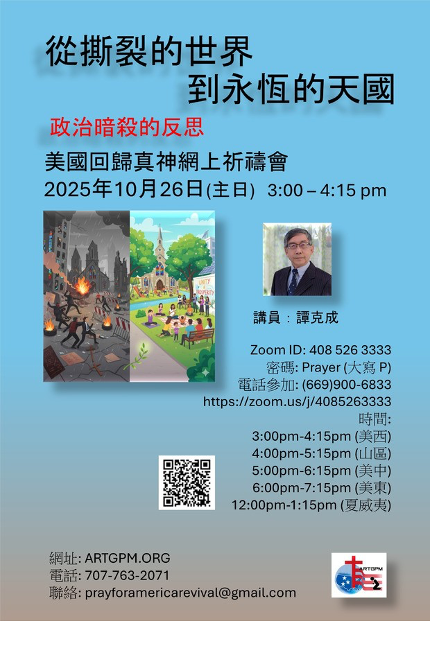- 請預留時間參加10月26日3:00 – 4:15 PM 舉行的美國回歸真神禱告會。人類歷史中的軍政強權此起彼落。美國的強大,是建基於基督福音的信仰,和廣納追逐夢想的移民。自由、民主、平等、人權等基要價值,穩定豐富的生活,也曾吸引了你離鄉別井,移居美國。時移世易、盛世轉衰。今日耳聞目睹:社會嚴重撕裂、政黨爭鬥不息、政令離經叛道、貧富鴻溝難填 … 本該透過三權分立的民主政制,平等尊重的和平對話,來尋求共贏的解決方案,但卻不斷湧現出政治暗殺和武力衝突。基督徒如何能發揮鹽和光的屬靈影響力,導引離棄了真神的美國,從撕裂的世界進到永恆的天國?請廣邀關心美國的基督徒們,一起來探索,同心來禱告。ZOOM ID: 408 526 3333 | 密碼:Prayer (注意P大寫); 直接鏈接:https://zoom.us/j/4085263333。