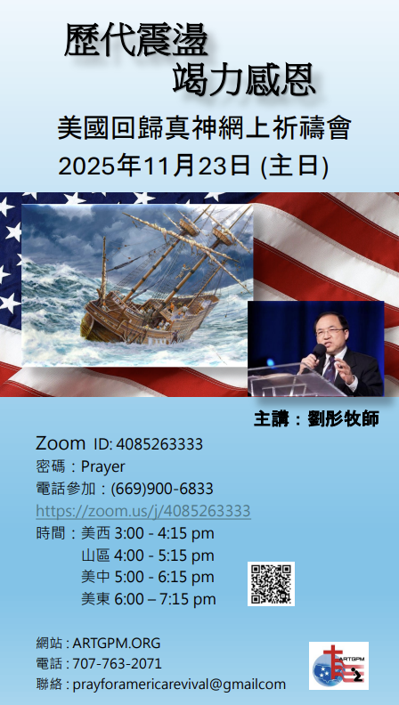 - 請預留時間,參加11月23日下午3 時正舉行的「美國回歸真神禱告會」。美國,是一個蒙神恩待的國家,回顧1620年清教徒乘坐五月花號來到這片土地,簽訂公約,定意尊崇上帝的榮耀,建立社群治理這地;儘管當時有近半數的人因病死亡,但他們仍然憑信堅立,向神獻上感恩,成為這片土地蒙福的根源。在困境中感恩,不僅討神悅納,也成為這片土地的精神。四百年來,美國經歷各樣動亂,獨立戰爭、南北戰爭、核子威脅、大蕭條、經融危機、總統遇刺、九一一恐怖攻擊、政黨撕裂、種族對立、示威暴動…,在一次次的危機當中,因著基督徒的禱告,神依然保守看顧這個國家。面對今日美國的震盪與危機,讓我們回歸神的心意,再次起來禱告,一同為這片土地守望,並獻上感恩。ZoomID: 4085263333,密碼:Prayer,https://zoom.us/j/4085263333